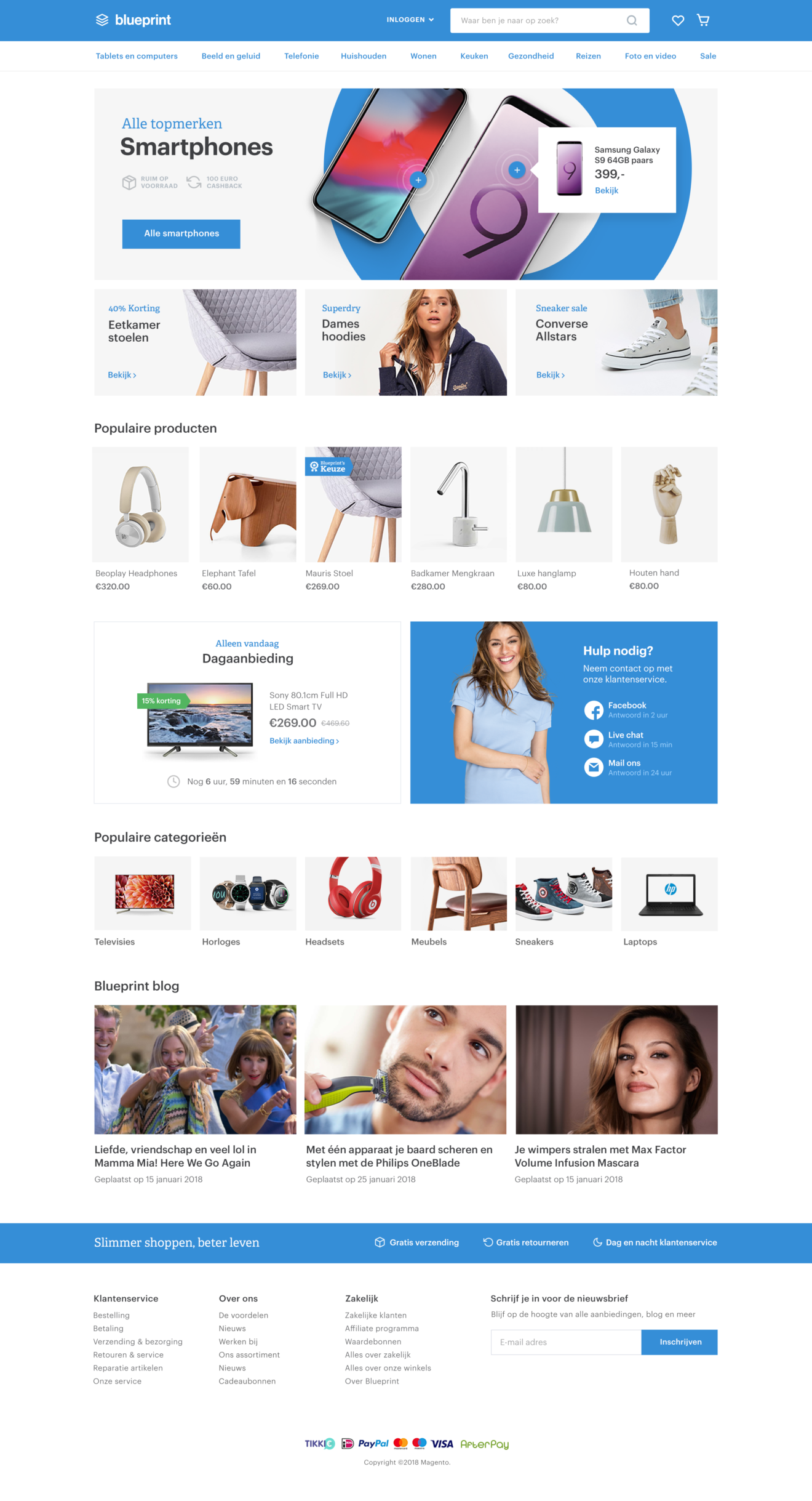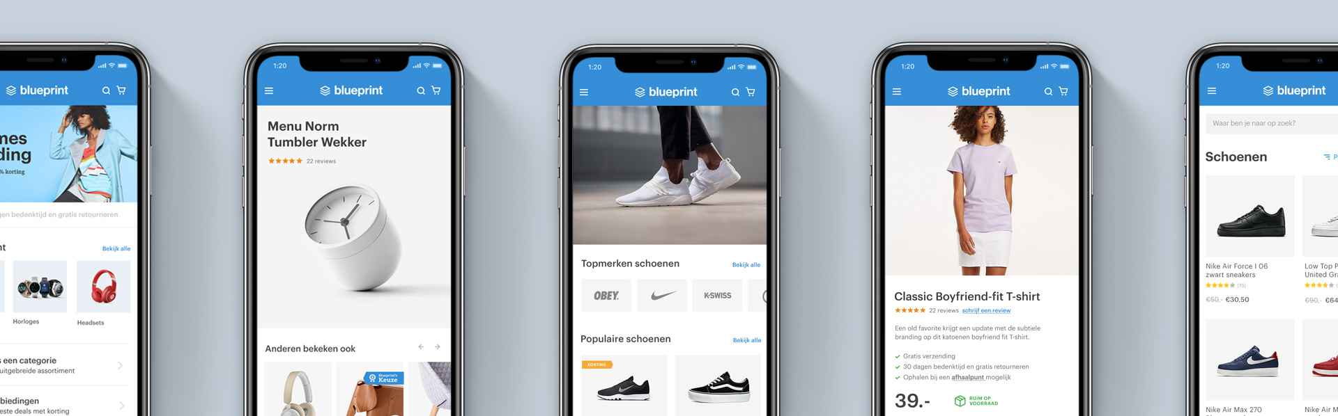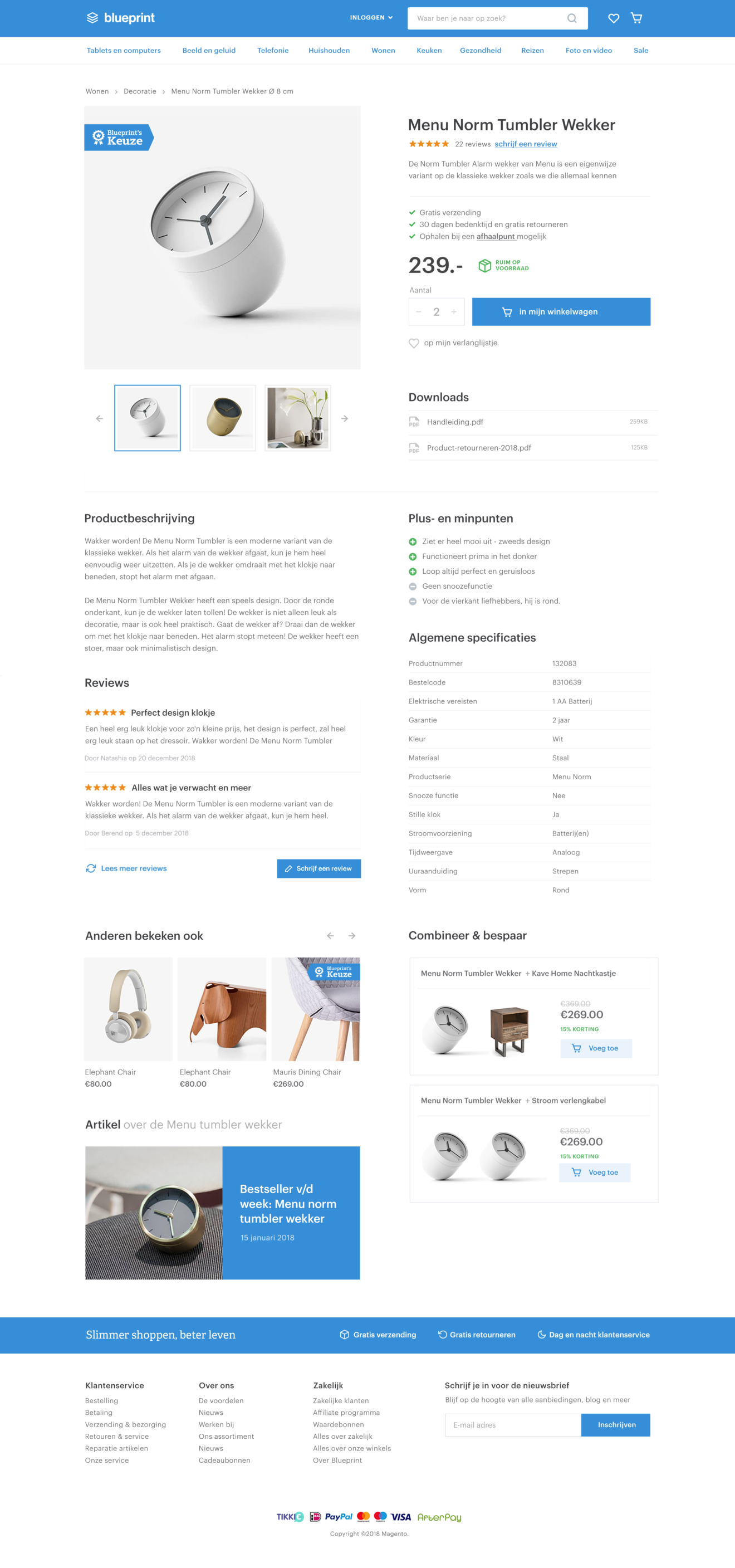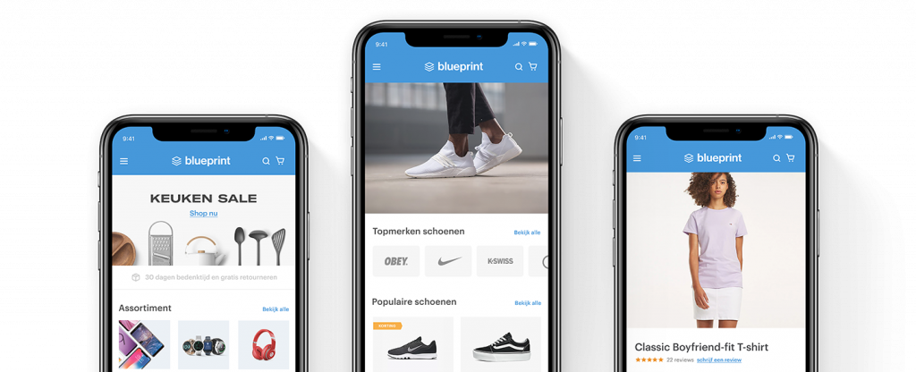 Blueprint Blueprint is een Magento 2 template, een startpunt voor elke shop die tickles bouwt. Mobiele schermen Ontwerp voor een productpagina, homepagina, categoriepagina en overzichtspagina.